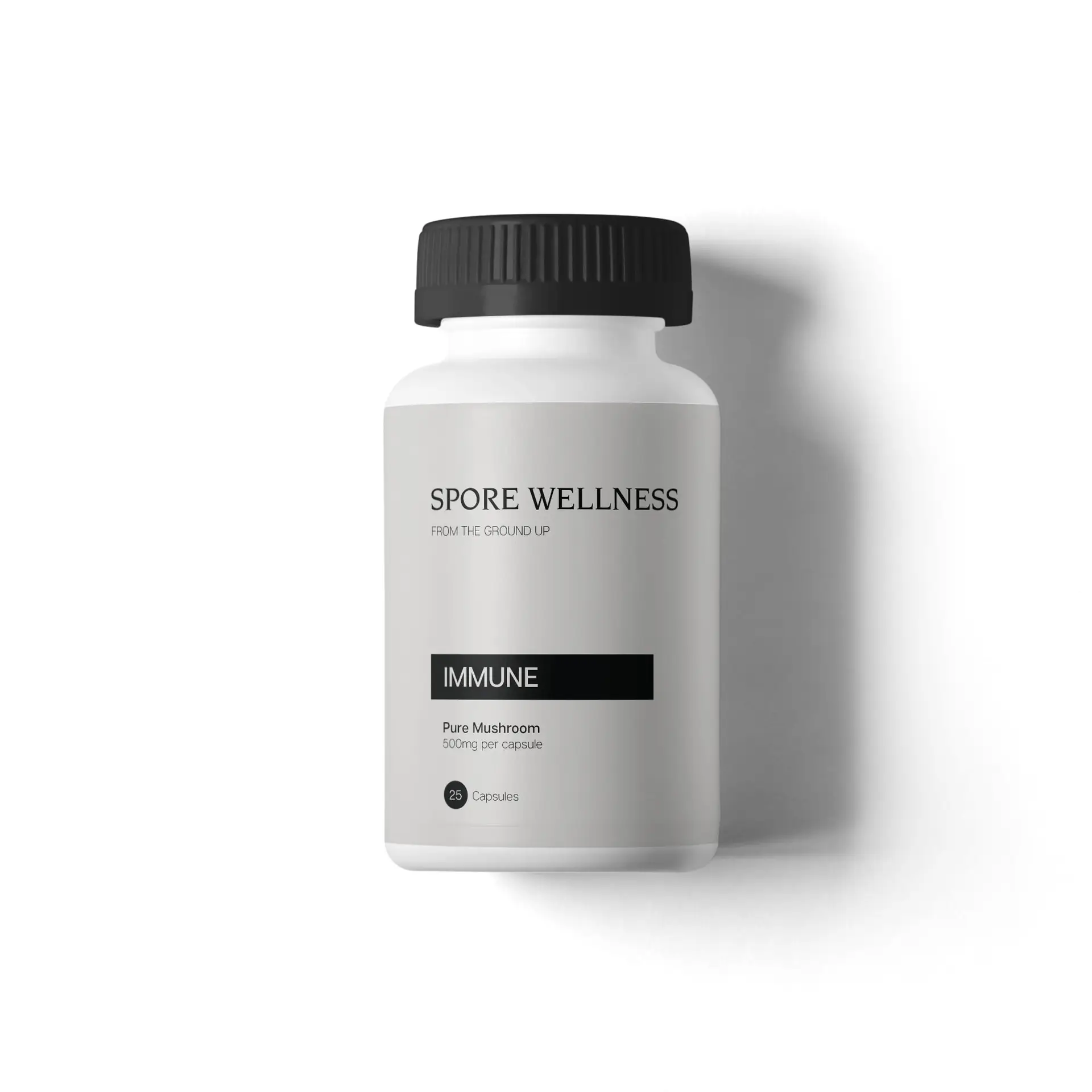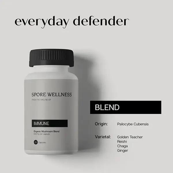 Spore Wellness Immune (SWI) is composed of a blend that includes Golden Teacher (psilocybe cubensis), Reishi (ganoderma lucidum), Chaga (inonotus obliquus), and Organic Ginger.